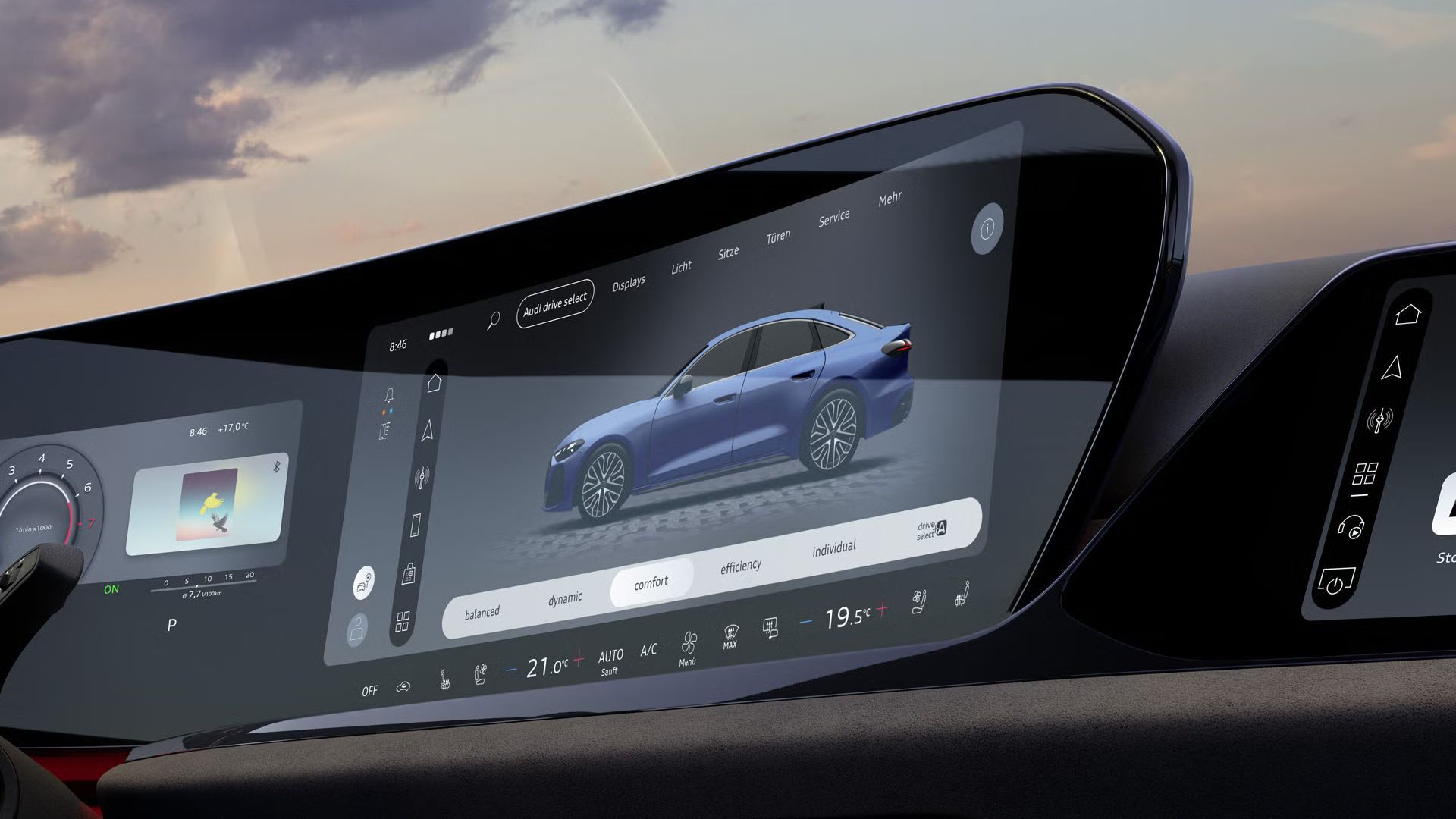 Ukrivljen panoramski OLED-zaslon, ki ga sestavljata virtualni prikazovalnik Audi plus in zaslon MMI touch, je obrnjen k vozniku. V kombinaciji z opcijskim sovoznikovim MMI-zaslonom3,4,5 lahko na primer ločeno upravljate navigacijo in razvedrilne vsebine.
