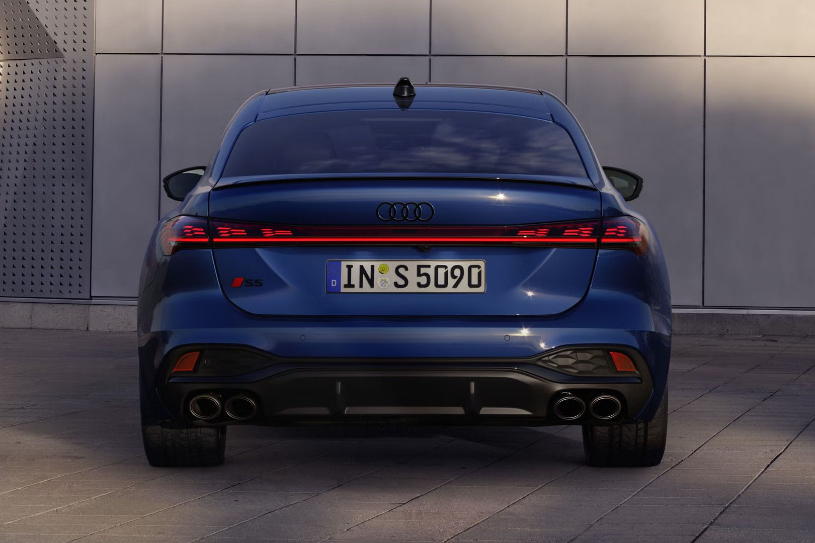 Audi S5 limuzina2 blesti v opcijski ascarijevo modri kovinski barvi9, 10. Za dodatne optične poudarke poskrbita športna satasta struktura enodelnega okvira mreže hladilnika in zadnji usmernik zraka. Slednji poleg izboljšane aerodinamike posreduje tudi jasno sporočilo.