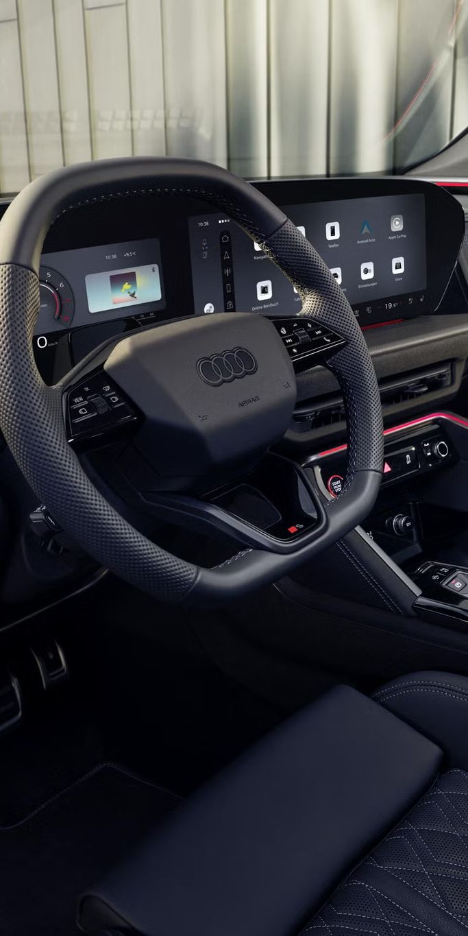Digitalno središče v notranjosti vozila: ukrivljen panoramski OLED-zaslon sestavljata virtualni prikazovalnik Audi plus in zaslon MMI touch.