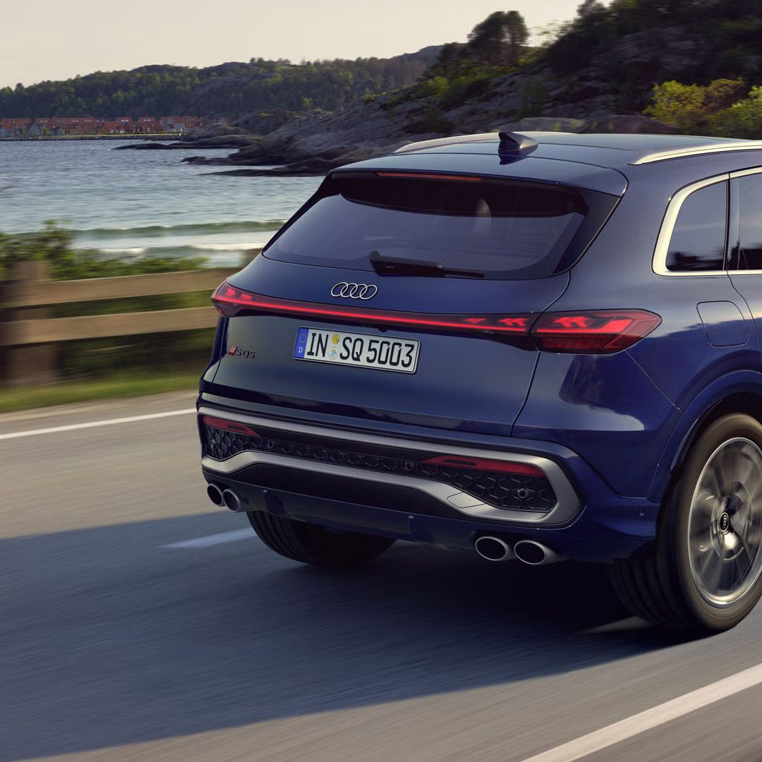 Zadek modela Audi SQ5 SUV2 prepriča z mogočno prezenco in jasnimi površinami. S-odbijač, markanten difuzor in dvojna zaključka izpušne cevi poskrbijo za športne poudarke. Opcijski zadnji OLED-luči4 poudarjajo design vozila.