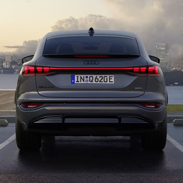 Audi Q6 Sportback e-tron6 odlikuje športno-mogočna prezenca. Ravno padajoči zadek z markantnim usmernikom zraka poskrbi za dinamično silhueto izvedbe Sportback. Opcijska magnetno siva barva laka7 z opcijskimi črnimi vgradnimi deli7 razkriva samozavestno dinamiko vozila.